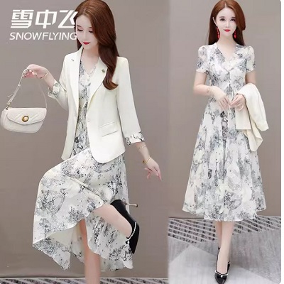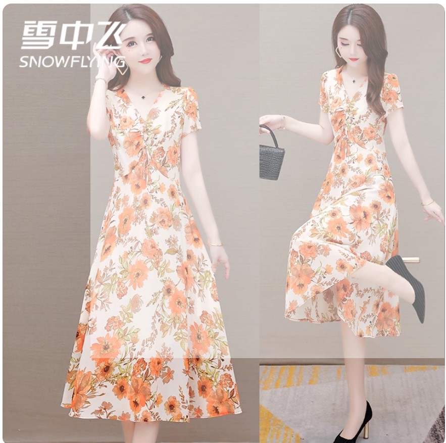 雪中飞薄款V领碎花连衣裙大码雪纺女款